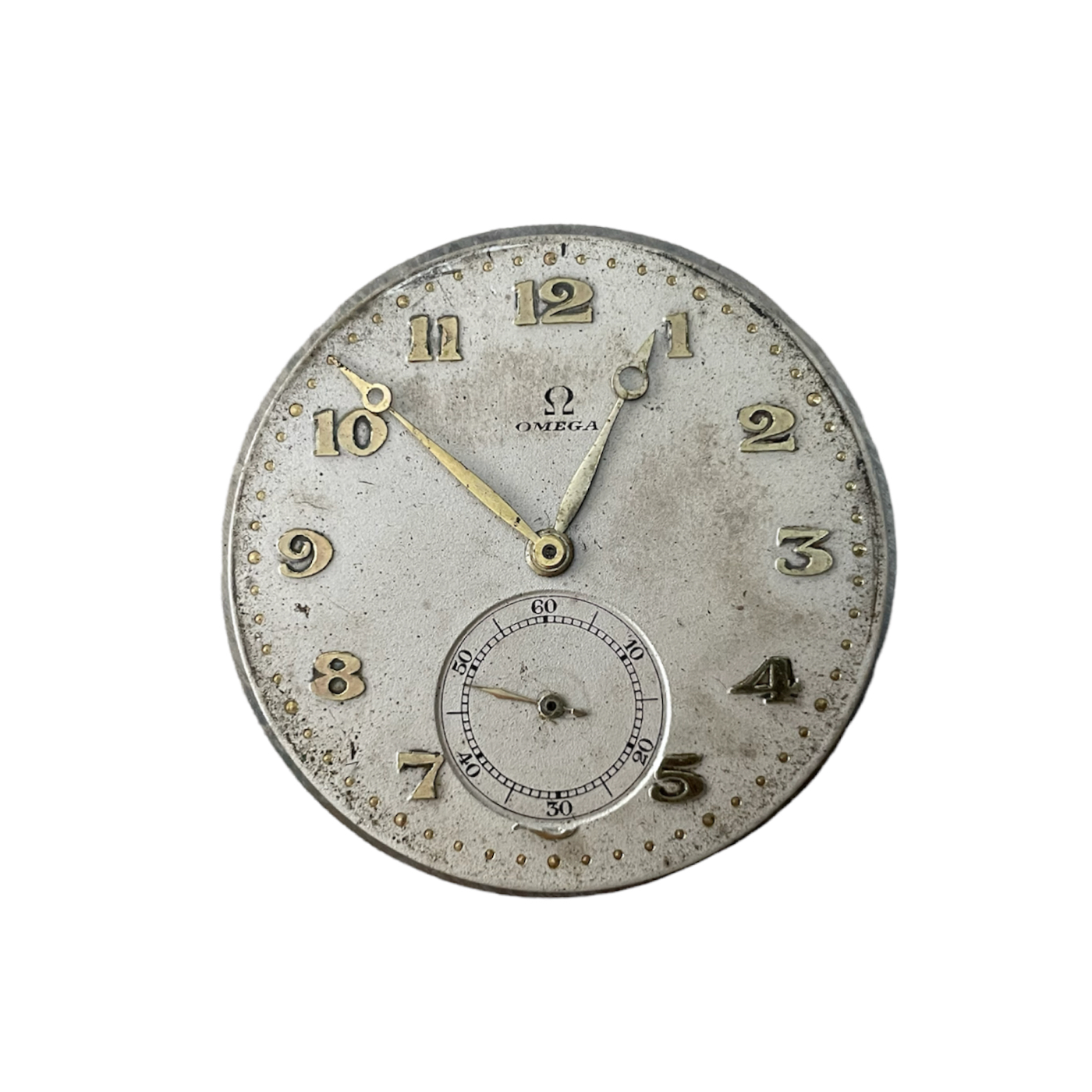 Този античен механизъм за джобен часовник Omega е в работно състояние, но се нуждае от почистване и смазване. С диаметър 35.5 мм, той е идеален за любители на часовници и колекционери, които ценят класическите механизми.