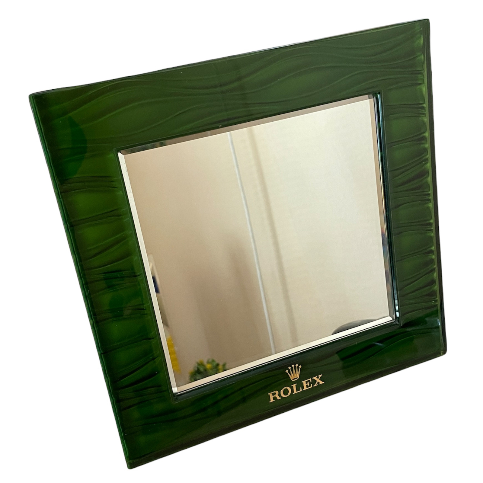 Това е стилно зелено огледало с рамка от кожа, произведено от Rolex. Идеално за декорация на вашия дом или офис, то добавя елегантност и изтънченост на всяко пространство.