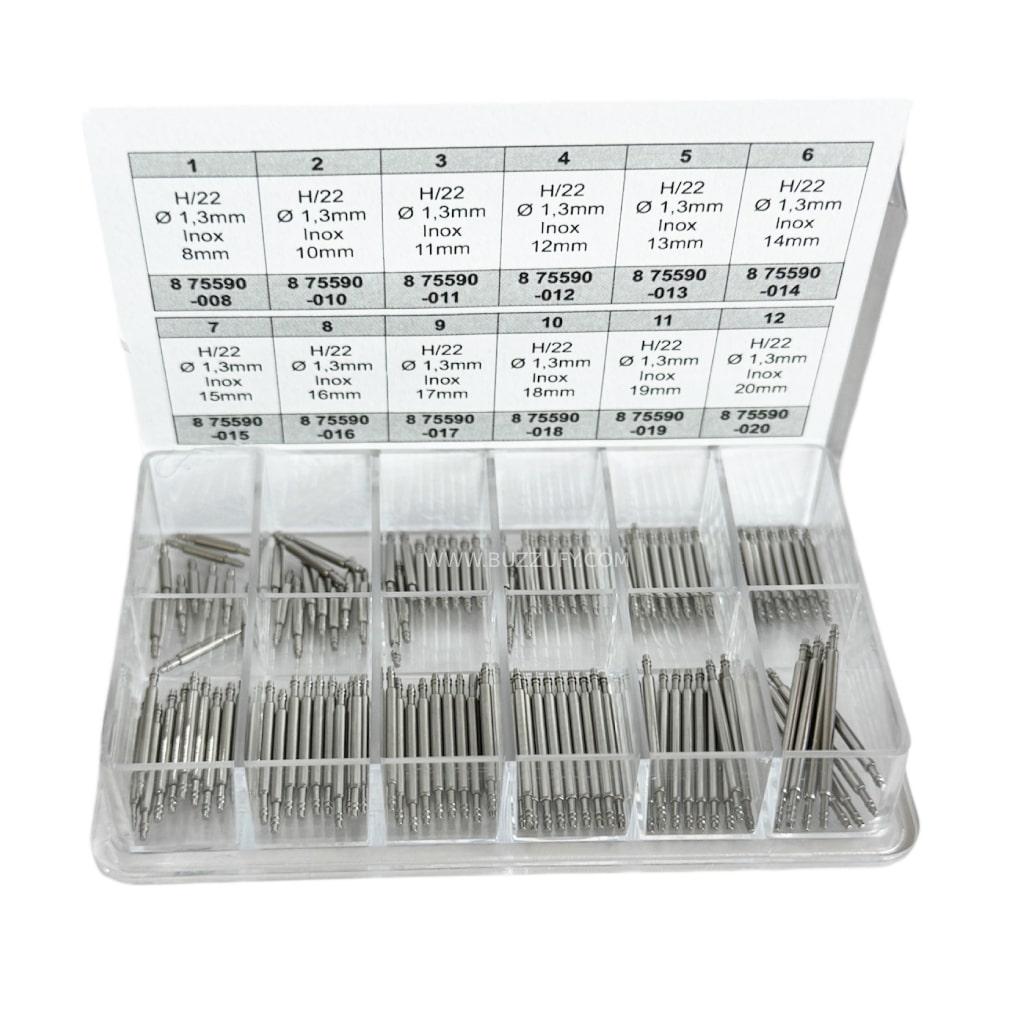 Този комплект съдържа 120 пружинни щифтове с двойно фланцово покритие, изработени от инокс с дебелина 1.30мм. Щифтовете са налични в различни размери, вариращи от 10 мм до 22 мм, с диаметър на пина 0.80 мм.