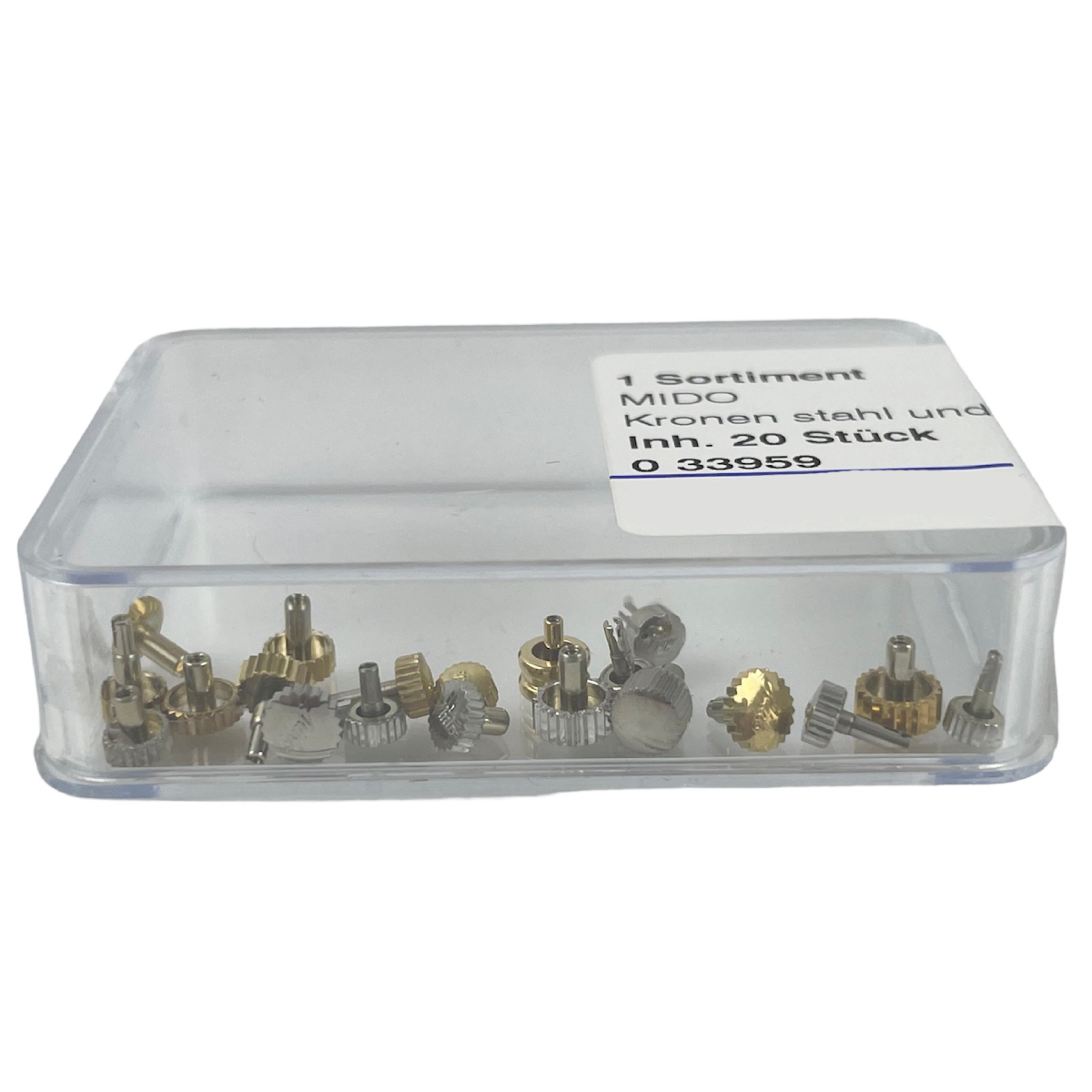 Този комплект от 20 корони с лого е идеален за винтажни часовници MIDO. Състои се от корони в златист и сребрист цвят, които ще придадат стил и елегантност на вашия часовник.