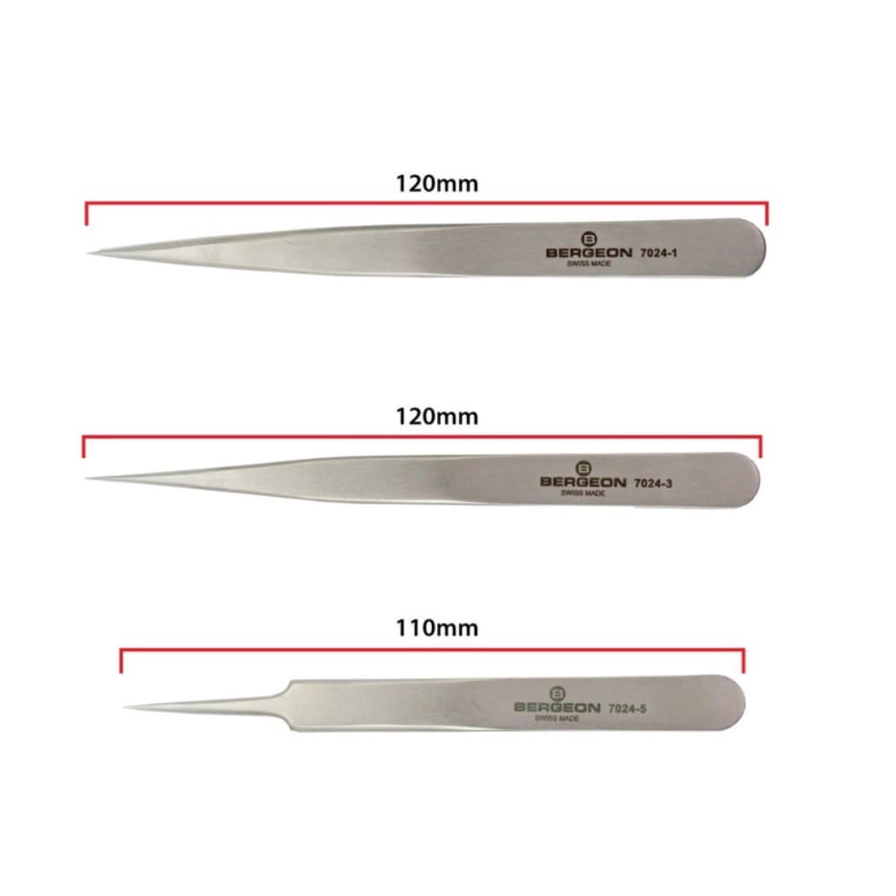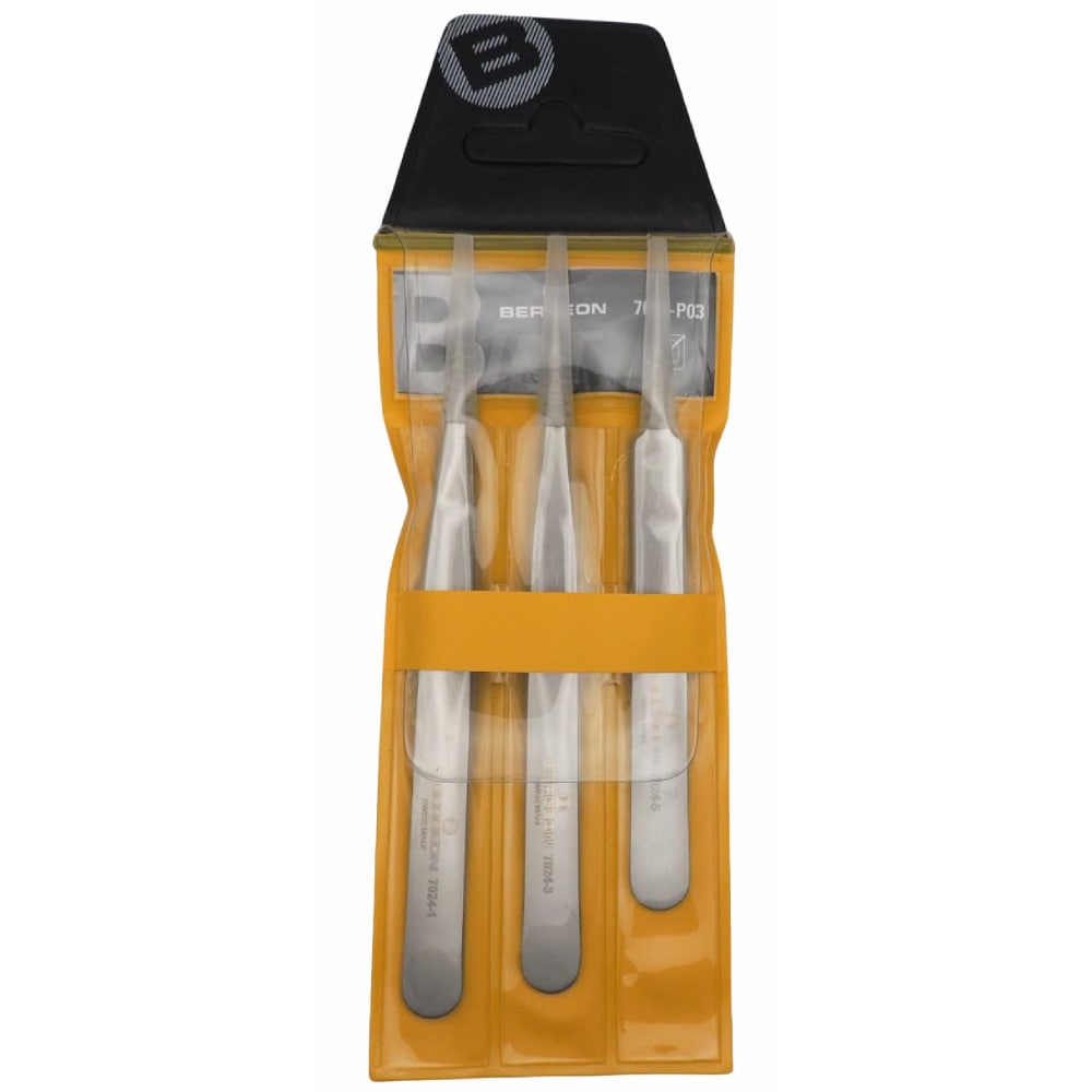 Този комплект от швейцарската марка Bergeon включва три прецизни пинсети от серията Bjet: модели #1, #3 и #5. Изработени от немагнитна неръждаема стомана, те предлагат дълготрайност, висока термоустойчивост и отличен контрол за деликатна часовникарска работа и фини механични задачи.
