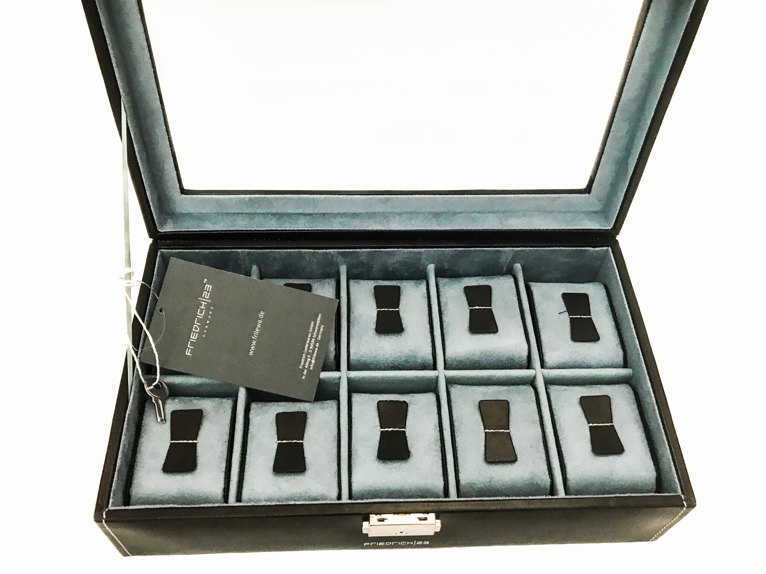 Кутията за часовници Friedrich|23 е изработена от висококачествени материали и предлага стилен начин за съхранение на вашите часовници. С голям прозорец от стъкло, можете лесно да преглеждате колекцията си. Вътрешността е изработена от фини синтетични материали, а кутията разполага с заключващ механизъм за допълнителна сигурност.