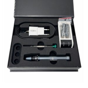 Този иновативен инструмент разполага с моторизирана система за навиване с еластомерен накрайник, който сигурно захваща коронката на часовника ви, без да причинява драскотини или повреди. Независимо дали сте левичар или десничар, кутията на Bergeon предлага режими за навиване в двете посоки. Просто натиснете надолу на коронката или регулирайте пръстена в предпочитаната посока и оставете мотора да свърши останалото.