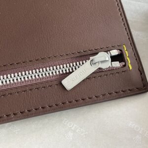 Този нов кожен портфейл в кафяв цвят е идеален за съхранение на множество валути. С размери 16 x 12 см, той е компактен и удобен за носене. Портфейлът разполага с четири ципа, които осигуряват лесен достъп до вашите пари и карти.