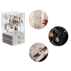 Горната част включва три вертикални чекмеджета за показване на обеци и вериги. Прозрачният материал осигурява лесна видимост, така че можете да се наслаждавате и да имате бърз достъп до вашите бижута. Независимо дали за домашна употреба или в бижутерски магазин, този органайзер предлага впечатляваща и практична демонстрация.