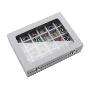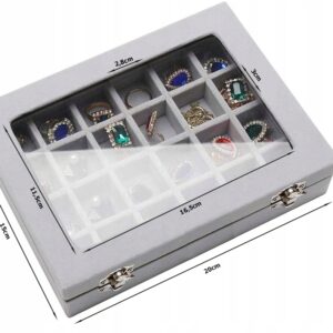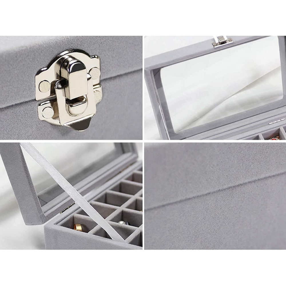 Този органайзер за бижута е стилно и практично решение за съхранение на бижута, което позволява те да бъдат подредени, защитени и лесно видими. Изработен от елегантен сив велур, с капак от стъкло, който позволява съдържанието да бъде видно без отваряне на кутията, той е идеален както за домашна употреба, така и за бижутерийни магазини и павилиони.