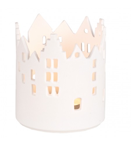 Тази осветена къща, изработена от най-финия порцелан, ви кани да мечтаете. Продуктът е ръчно изработен с внимание към детайла. Порцелановата основа служи за поставка на чаена свещ, създавайки уютна атмосфера във вашия дом.