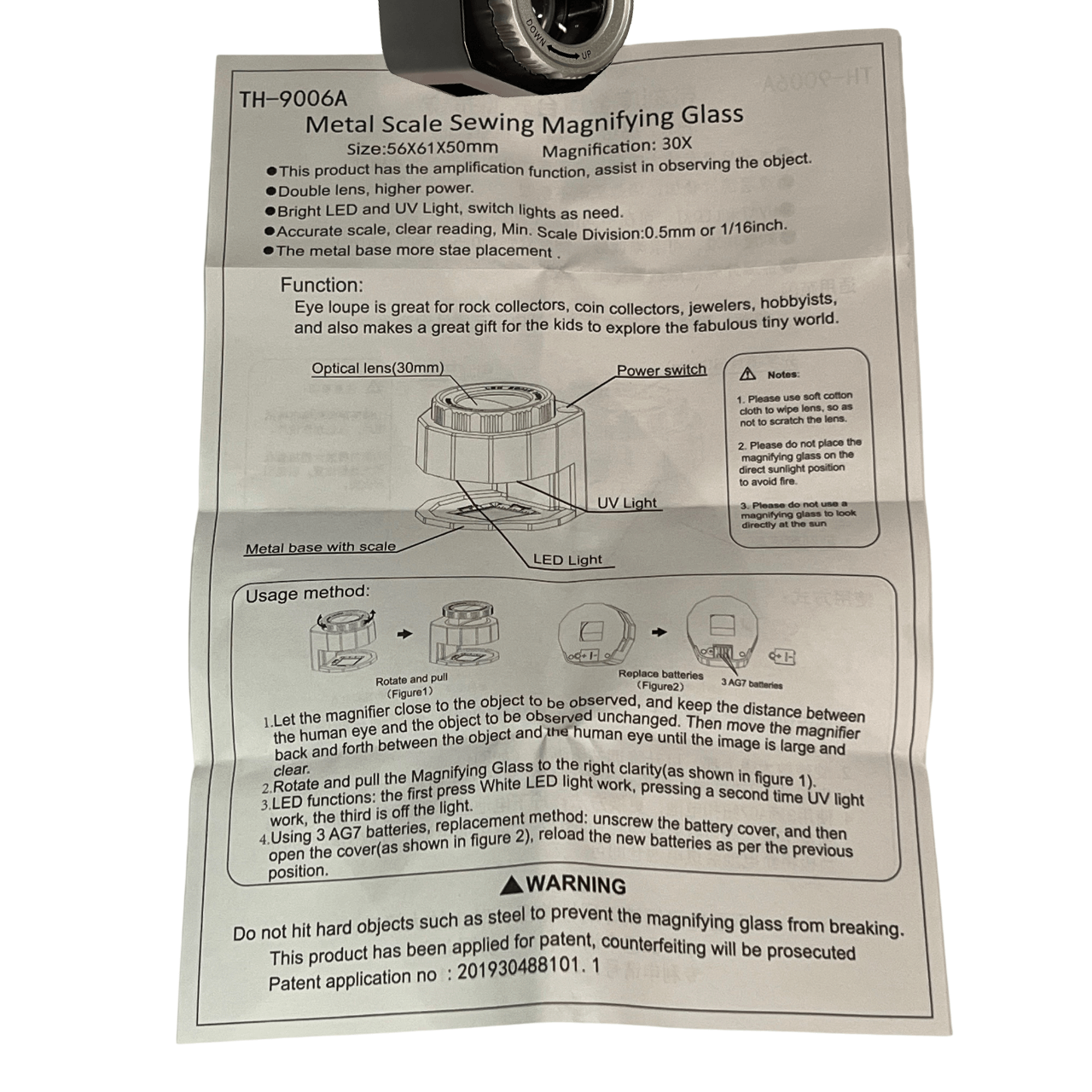 Лупата TH-9006A с 30-кратно увеличение е компактна прецизна лупа, предназначена за детайлна проверка и измерване. С двойна леща за по-голямо увеличение, тя осигурява ясно и уголемено виждане на малки обекти, като например компоненти на часовници, детайли за шиене, печати, бижута и електроника.