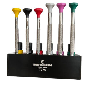 Комплектът на Bergeon 7778 е с здрава неплъзгаща се основа, изработена от POM-C пластмаса. Отвертките разполагат с назъбена дръжка и въртяща се глава. Включени са по 2 резервни остриета за всяка отвертка.