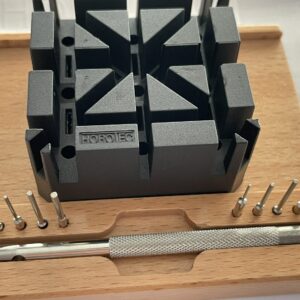 Horotec MSA 10.510 е инструмент за скъсяване на верижки с 1 универсална поставка в дървена основа.