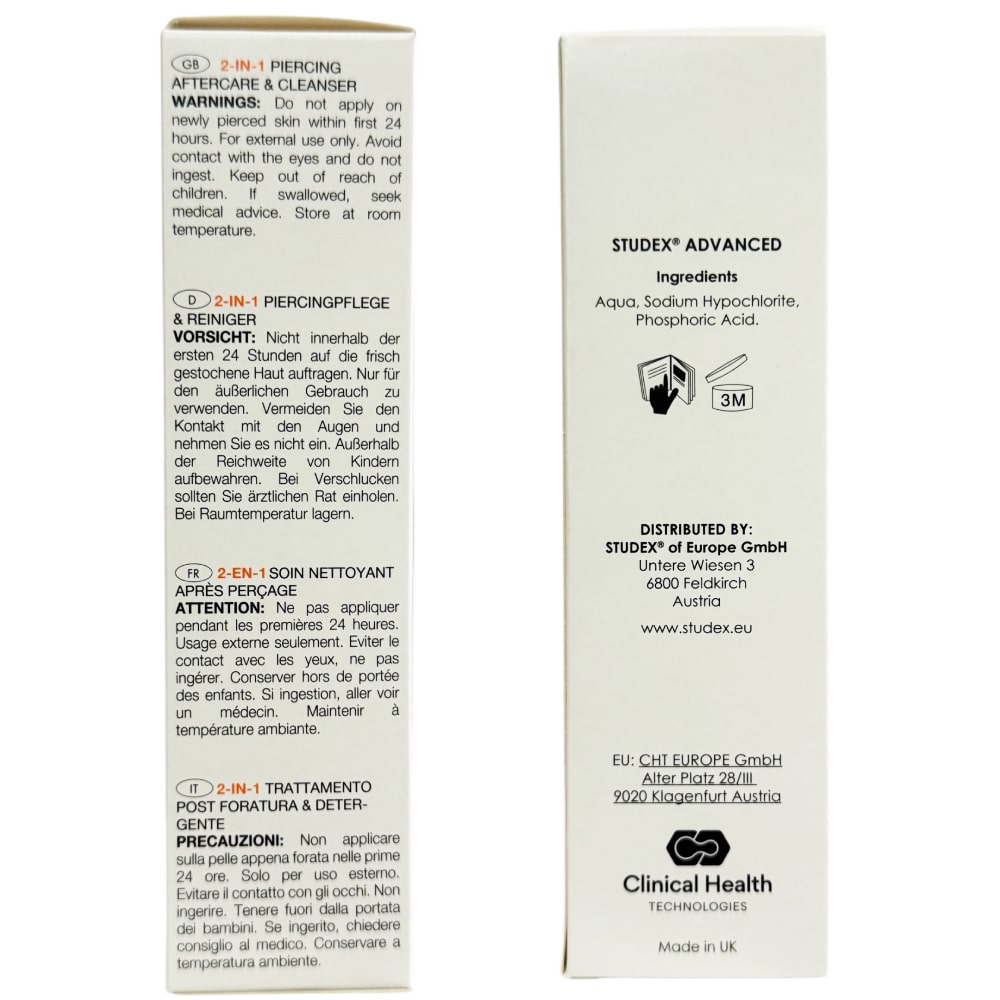 Грижете се за новите си пиърсинги с STUDEX Advanced 2 в 1 следпирсинг грижа и почистващ препарат. Правилната следгрижа е също толкова важна, колкото и избора на подходящи бижута и посещението при опитен професионалист. Тази напреднала формула е проектирана да се използва два пъти на ден, започвайки 24 часа след пиърсинга, и помага за предотвратяване на възпаление и други усложнения.
